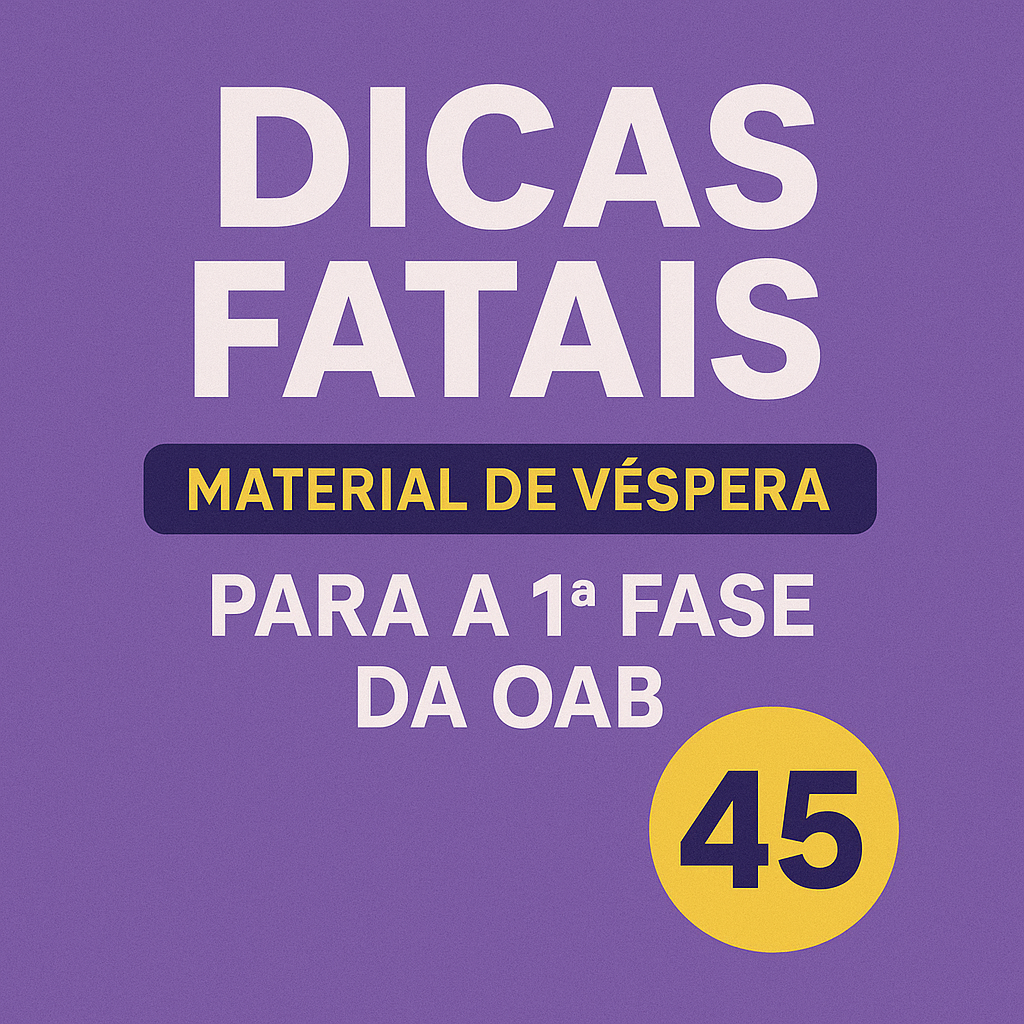 Com as Dicas Fatais para a 1ª fase do Exame 45 OAB, aumente suas chances de aprovação na prova. Receba mais de 1.000 dicas estratégicas e vídeos exclusivos com nossos professores para estudar com confiança total. Garanta agora o material completo e otimize sua revisão na véspera do exame.